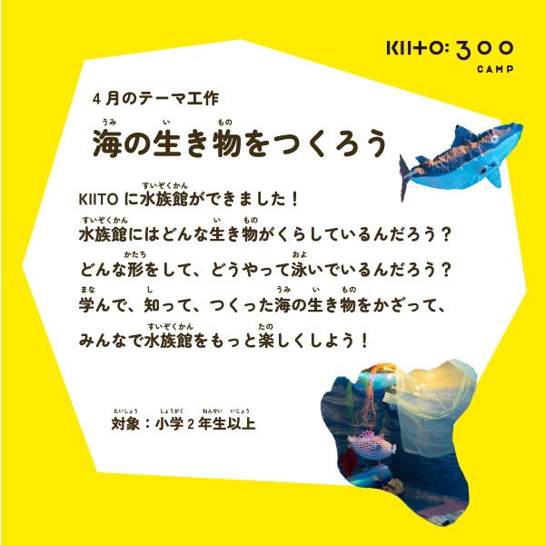 KIITO:300キャンプでは、テーマに沿って工作を体験するプログラム「テーマ工作」を開催しています。4月は「海の生き物をつくろう」です。