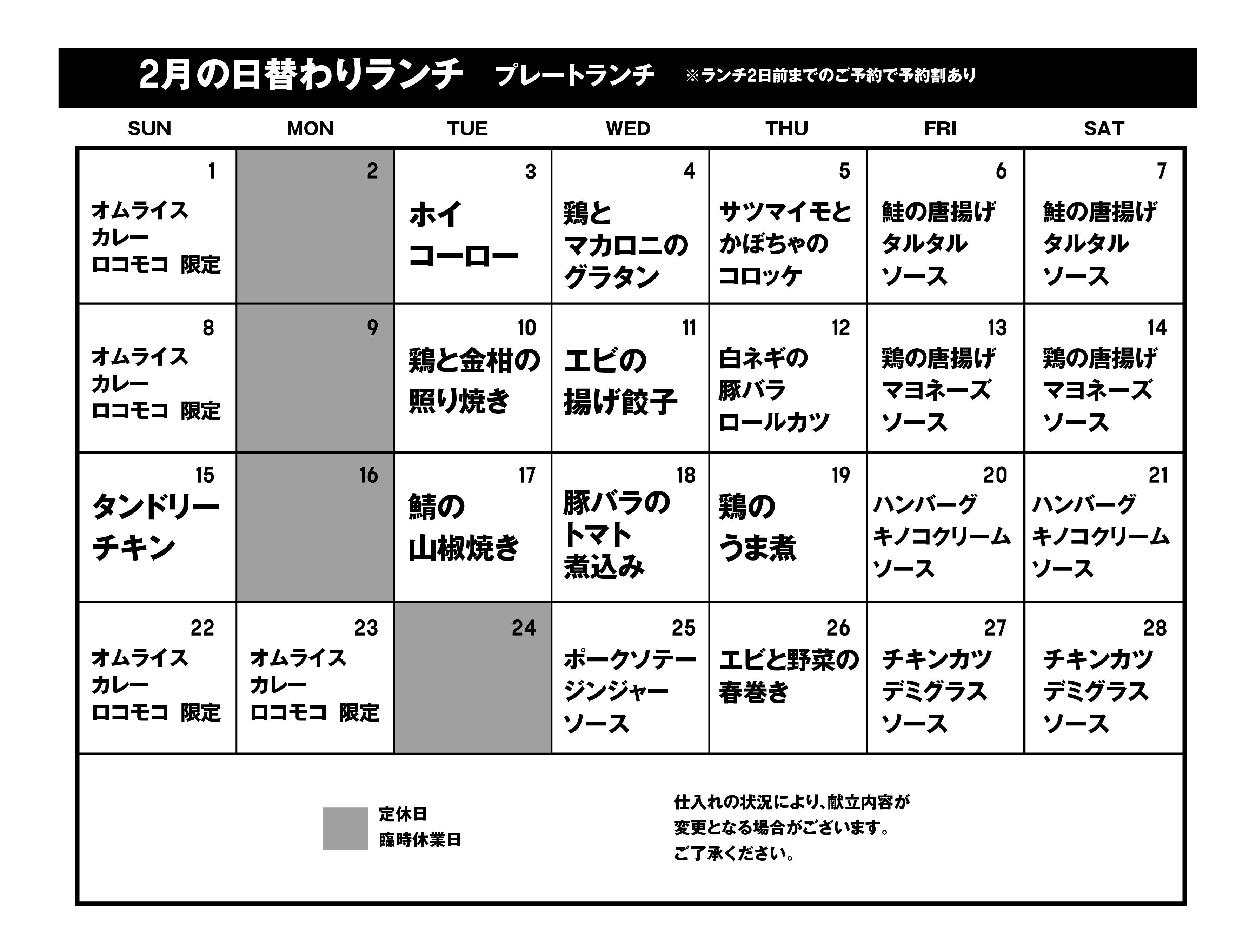 <2月の日替わりランチメニュー>